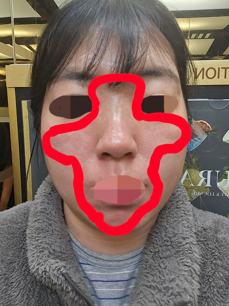 사진에서 보이는 양상은 코를 중심으로 양측 볼과 입 주변까지 대칭적으로 홍반이 분포하고 있고, 세안 시 작열감이 있었다는 점을 고려하면 단순 접촉성 자극 피부염(irritant contact dermatitis) 가능성이 가장 높습니다. 특히 새로운 화장품, 클렌저, 마스크 장시간 착용, 각질제거 제품(필링, 레티노이드 등) 사용 이후 흔히 발생합니다. 현재 통증은 감소했으나 홍반이 지속되는 경과도 이에 부합합니다.