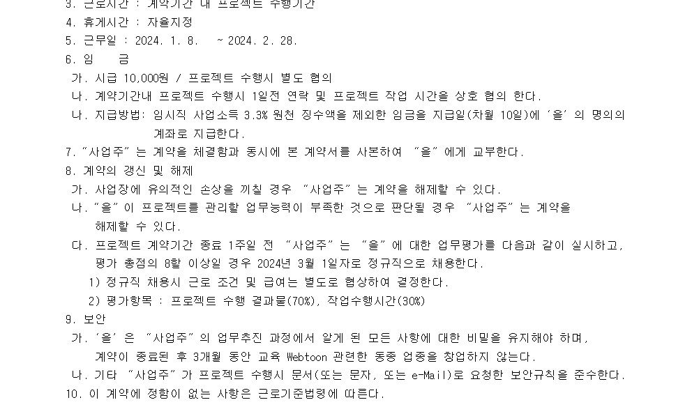 제가 웹툰회사에 취직을 했는데 면접 전에 분명히 이런 이런 부분은 못한다 이정도는 할 수 있을 것 같다. 솔직하게 말씀드렸기에 저는 떨어질 거라고 거의 90%이상 확신하고 있었는데 예상과는 다르게 합격을 했습니다. 그리고 수습기간 2개월 계약서를 먼저 썼고 계약서에 계약 기간이 끝나기 1주일 전에 지금까지 한 업무에 대한 평가를 하여 정규직 전환 여부를 결정한다고 되어 있습니다.