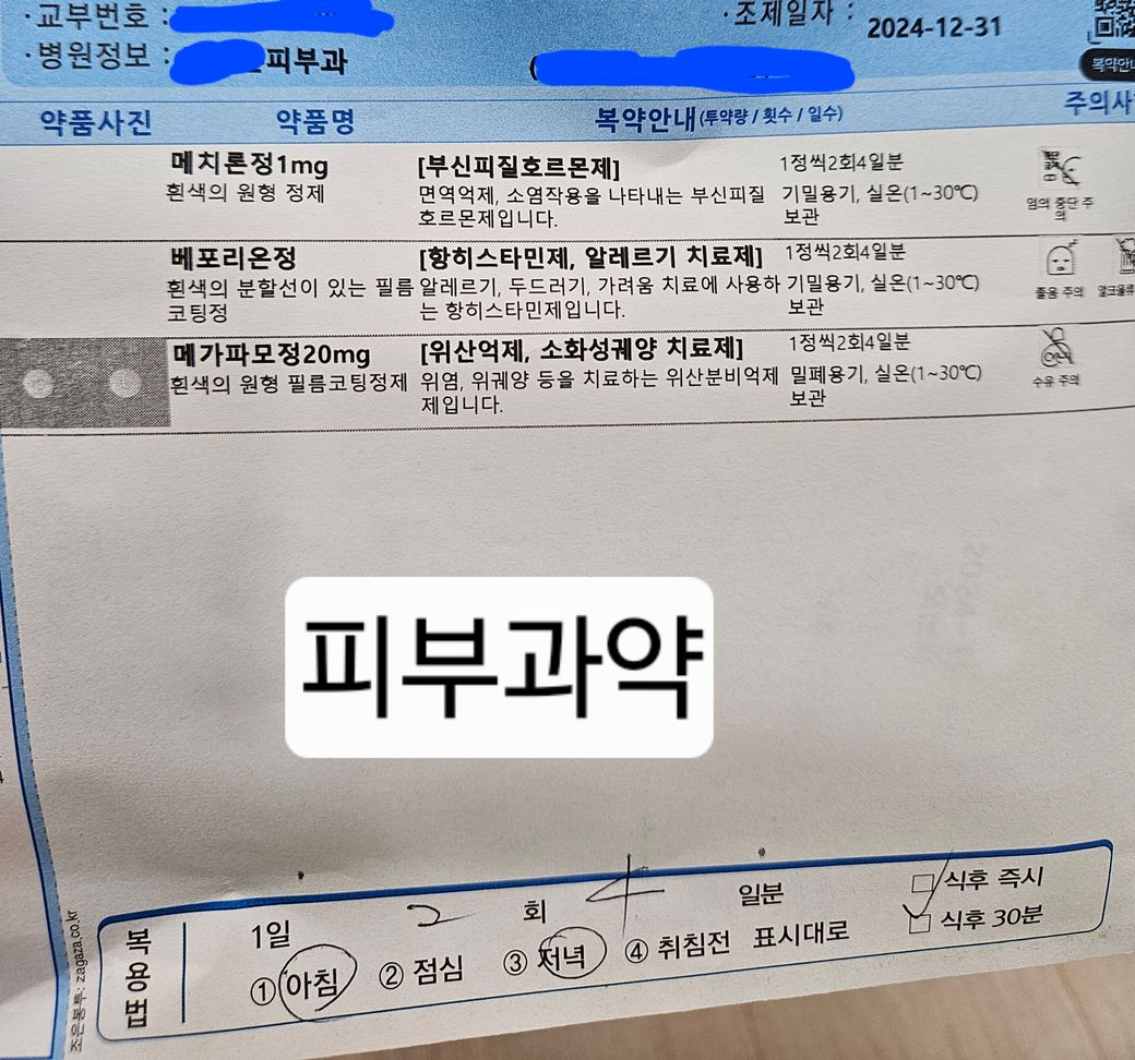 어제저녁에 음식을 잘못먹었는지 오늘 아침에 일어나자마자 입술이 탱탱붓고 팔에 두드러기가 살짝올라와 피부과를 다녀왔는데