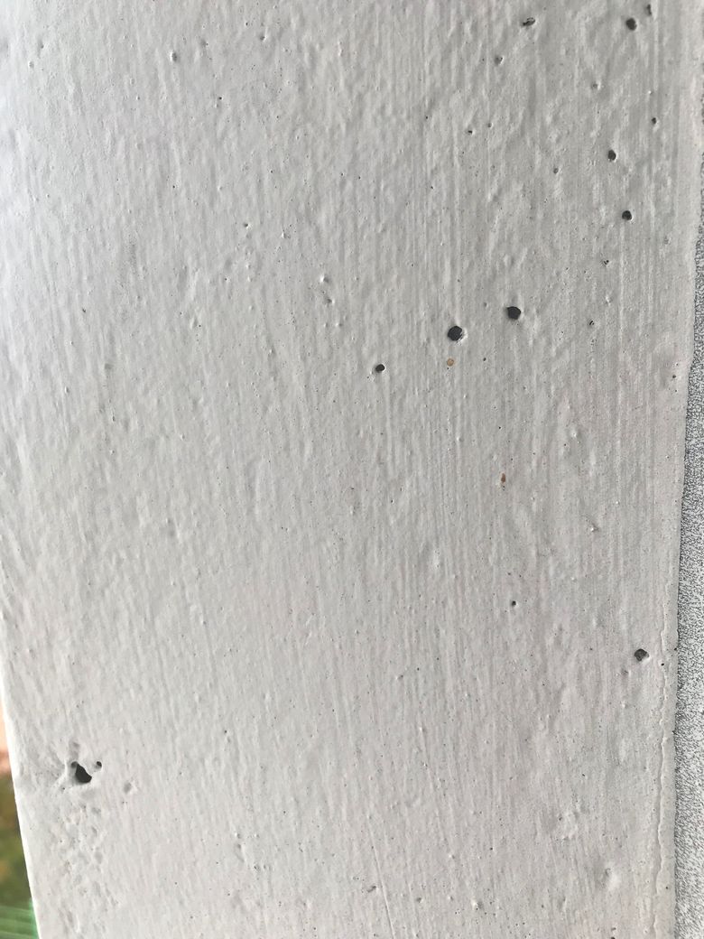 안녕하세요 구멍같은경우는 페인트가 시간과 자연에 따라 벗겨지면서 생기는 자연스러운 현상입니다. 페인트할때 공기가 들어가고 그위에 페인트칠을 하게되었을경우 시간이 지나면 저런 작은 구멍들이 생깁니다. 골조에는 이상이 없으니 크게 염려하지 않으셔도 됩니다