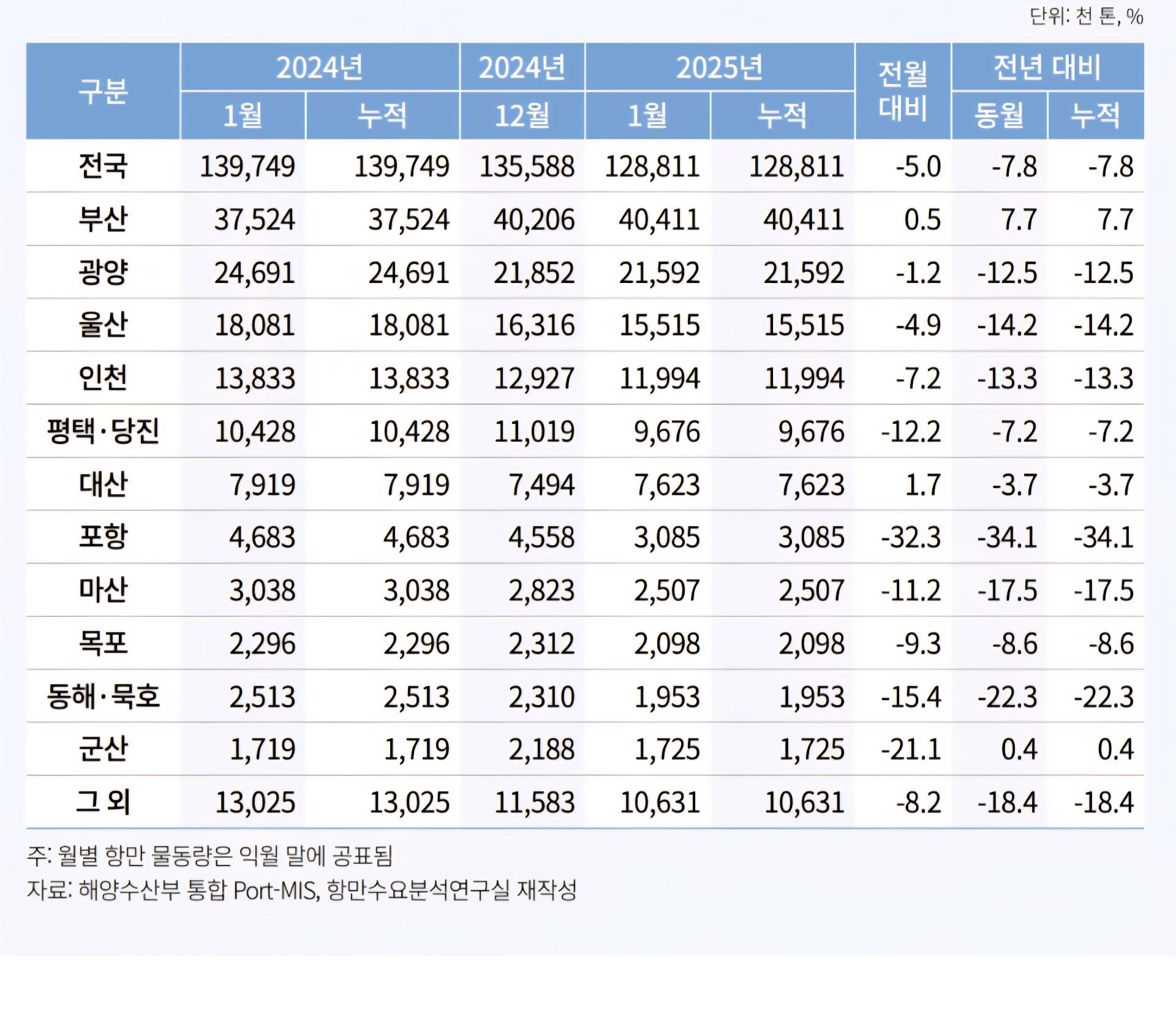2025년 1월 통계에 의하면 부산, 광양, 울산, 인천 순입니다.
