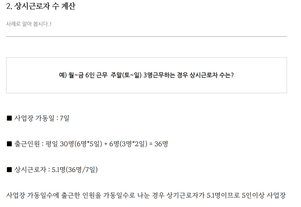 사례의 경우 상시근로자수는 (2×3+2×2+3×5)÷7=3.8이므로 3명입니다.