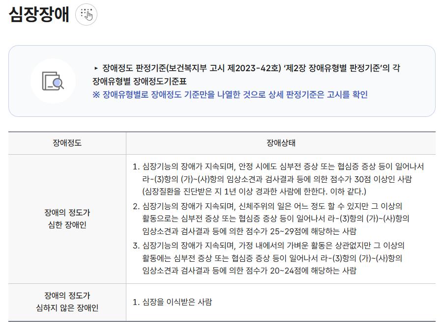아래 기준과 같은데 심장 박동기를 달았다고 바로 기준을 만족하지는 않고 초음파검사 등으로 측정한 심장의 기능이 떨어지면서 아래 기준을 충족해야 장애진단이 가능할 것으로 판단됩니다.