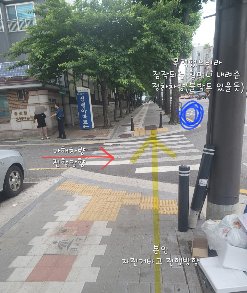 저는 차가 윰직이는거 보였을때 어? 어라 따릉÷(₩?₩ 울렸는데 못들었는지 계속 움직이더라고요. 저는 오른쪽으로 피해서 가려고 했는데 결국 부딫혔어요.