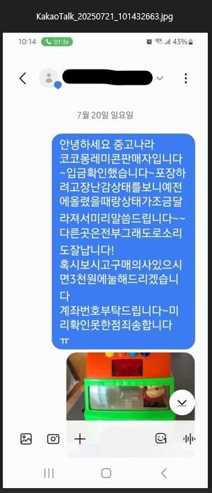 6년전에 올린 중고나라 장난감을 구매한다는 메세지를 확인했습니다.