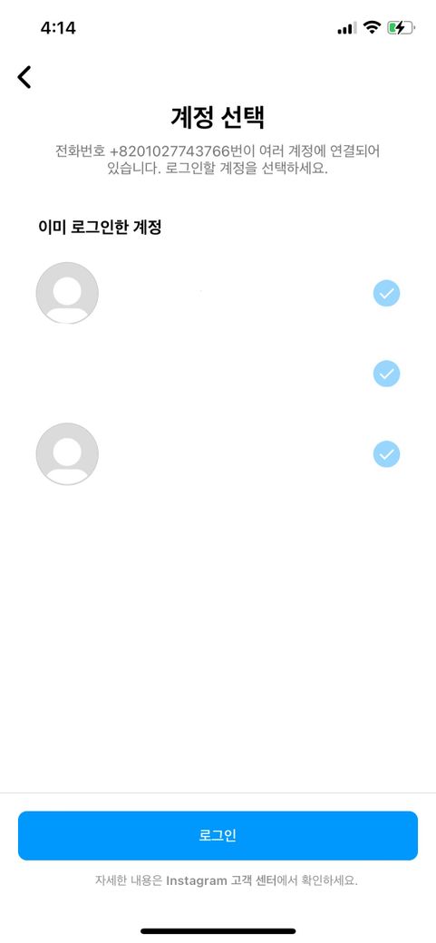 인스타에서 계정 하나가 비밀번호가 생각이 안 나서 비밀번호를 잊어버림을 누르고 전화번호로 인증코드를 받아 연결된 계정으로 로그인 시켜주는 페이지가 떴는데 막상 잃어버린 계정은 없고 이미 로그인 된 계정들만 보이는 상태에서 사진에서 아래 있는 로그인 버튼을 누르고 무한 로딩 상태가 되어서 앱에서 나갔다가 다시 들어오니 무한 로딩 상태는 해결되었어요. 해당 페이지에서 이미 로그인 된 계정들만 있는 상태로 로그인 버튼을 누르면 해킹당하나요?