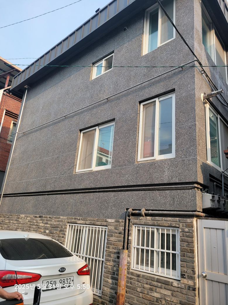 사진을 보니까 건물 외벽 시공 방식은 '셀룰로오스 단열재 습식 공법'일거 같아요. 이건 재활용 신문지 등 종이 섬유에 난연 처리와 방부 처리를 하여 만든 친환경 단열재를 물과 접착제에 섞어 기계로 분사하는 방식인데 방수도 되죠.