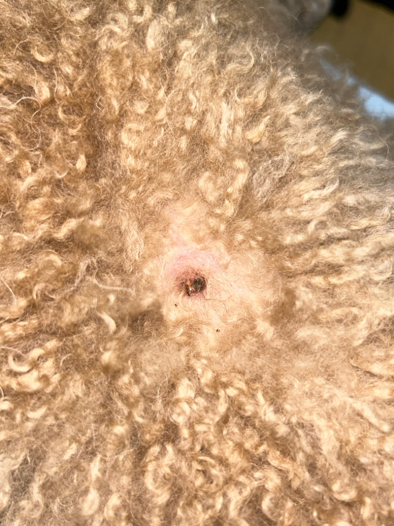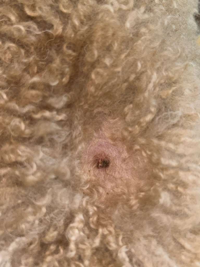 강아지 등에 생겼는데 좀 커지더니 약간 고름? 같은 것도 보이고 그러네요 월요일에 바로 병원 가보긴 할건데 걱정이 돼서... 무엇으로 보이시나요ㅠㅠ 참고로 애가 털이 복슬복슬해서 피부가 다친적은 거의 없었으며 사진은 진료 용이하게 받으려고 집에서 바리깡으로 털 조금 밀었습니다ㅠㅠ 약간 볼록하게 튀어나와있고 0.8센치정도 되어보여요 주변 살 만졌을때 아파하진 않습니다