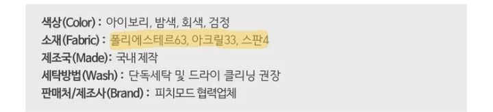 폴리에스터 (Polyester) 63%, 아크릴 (Acrylic) 33%, 스판덱스 (Spandex) 4%로 구성된 혼방 원단을 사용하면 보풀이 발생할 수 있습니다.