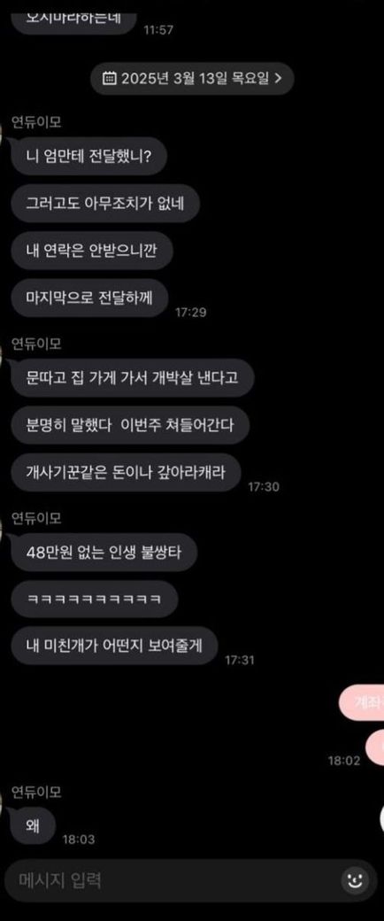 친동생이 제가일한다고전화못받은걸피한다고생각하고 제딸아이겨우 20살 인데혼자두아이를키우며어렵게살아서일찍취업을나갔읍니더 그런딸아이에게이런문자카톡을보냈읍니다 분해서죽을꺼같아요예전에동생카드로6개월분할로빌려쓴게있는데 이제두번만넣으면되었는데 지가저렁보험애기때문에감정이안좋아서 돈을다달라고내가여낙이안됀다고다짜고짜딸에게이런문자를보낸것입니다