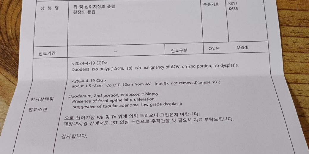 십이지장 AOV 에 있는 선종으로 내시경적 절제술이 필요한 단계 입니다. 현 단계에서 악성소견은 아니니 크게 걱정하지는 않으셔도 되겠습니다.