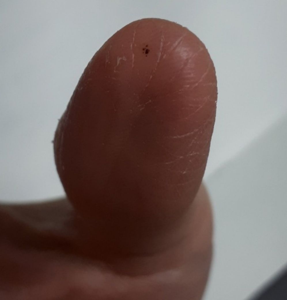 실제로 보기에는 아주 작긴 한데, 전 처음에 펜 잉크가 묻은 줄 알았는데 한 2-3일 정도 돼도 그대로 있는 데다가 타월로 빡빡 씻어도 안 지워지길래 피부염 같은 건가 해서 카메라로 찍었거든요.