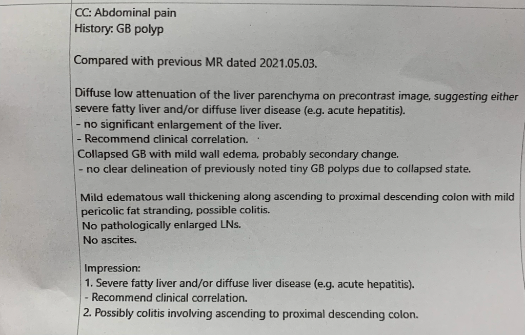 심한 지방간이 있고 급성 간염이 의심스럽다는 상행결장과 하행결장의 대장염의 가능성이 있어 보인다는 소견입니다. 관련하여서는 간 수치를 잘 낮춰주고 치료해주면 되겠습니다.