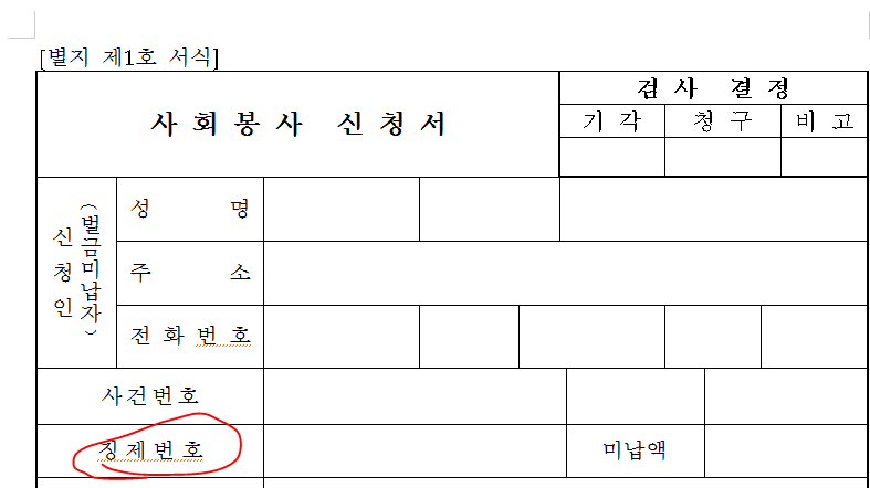 벌금형에 대한 사회봉사 신청서를 작성중인데, 징제번호가 뭔가요?