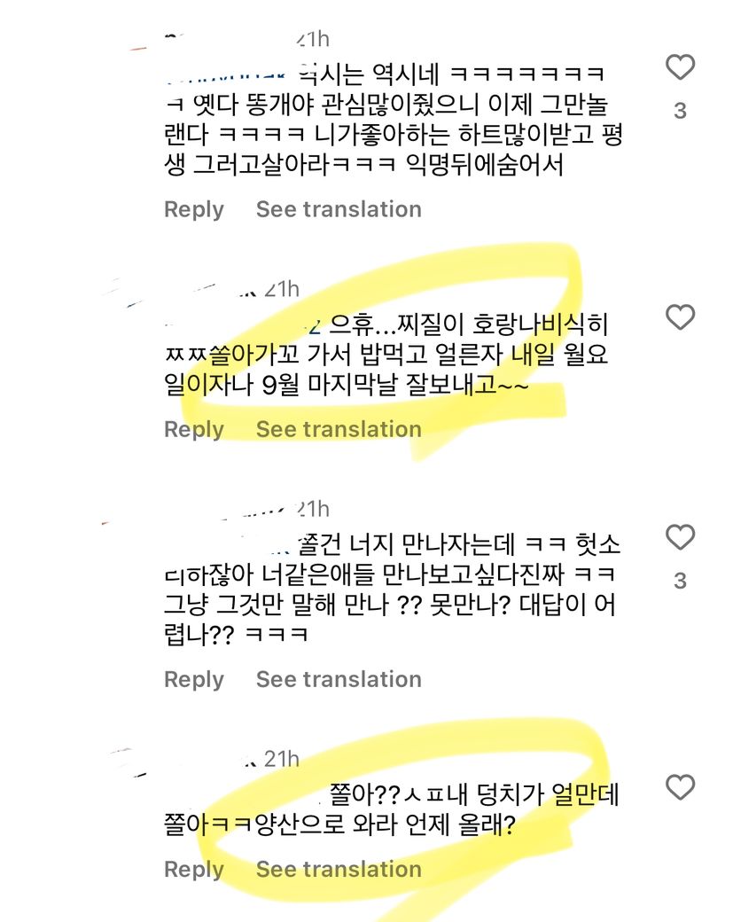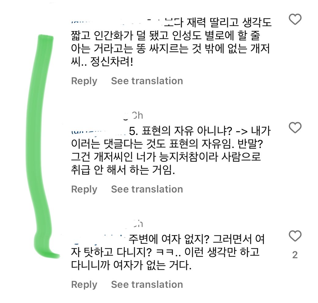 안녕하세요. 특정 여자 연예인의 릴스(딱 달라붙는 의상을 입어 몸매가 부각되어 보이는 영상, 보통 성적으로 바라보는 경우가 대다수인 특정 신체 부위 윤곽이 드러남) 댓글에 ‘얼굴만 예뻤어도..’라며 한 중년 추정 남성분(본인의 얼굴을 프로필 사진으로 함(선글라스 써서 눈은 안 보임), 비공개 계정임)이 댓글을 다셨습니다. 사람들이 답글로 뭐라고 하자 ‘탑 찍었을텐데.. 몸매 좋고 노래할 때 목소리 좋고’, ‘님 우동사리는 좀 잘챙기고 판단하세요‘, ’니 부모는 참 좋아하시겠다 부모님이 주신 소중한 몸에 그림이나 쳐 그려대고 아주 좋~~~아 하시겠네 ㅋㅋ‘라는 답글들을 달더라고요. 위 답글은 한 남성분(공개 계정이었으며 실물 사진이 게시되어 있음)을 향한 것이었고 이어서 다른 사람들의 댓글에도 비슷한 뉘앙스의 답글을 달았습니다. 그 모습을 본 저는 기가 차서 답글을 길게 달았습니다. 중간에 워딩이 센(누가 니 만나준대?, 현실에선 남성성이 딸리니 여자만 보면 이런다. 그마저도 현실에선 못하고 인터넷에서, 개저씨, 능지처참이라 사람 취급 안 해서 반말한다, @@아 정신차려, 주변에 여자 없지? 이런 생각만 하고 다니니까 여자가 없는 거다.) 발언을 했습니다. 욕설은 하나도 사용하지 않았습니다.(제 계정은 비공개 계정이고 본명 게시 안 했으며프로필 사진도 인물 사진이 아닙니다.)그러자 원댓글 주인인 중년 추정 남성분이 답글로 ‘캡쳐완료’라는 내용을 다신 겁니다. 저 말고 다른 분들(패드립을 하신 분, ㅈㄴ 찐따같애 라는 댓글을 다신 분)에게도 같은 답글을 달았습니다. 그래서 제가 ‘본인이 단 댓글이 처벌 가능성 더 높은 거 아시죠?‘라고 했는데 ‘네~ 선물 보내드릴게요^^’라는 답글을 달더라고요. 명예훼손이나 모욕죄 조건 성립되는지, 제 댓글이 모욕죄나 명예훼손죄 처벌이 가능한 건지, 가계정인데 처벌 가능성은 어느 정도인지, 중년 추정 남성분의 댓글은 처벌 가능한지 궁금합니다. 이 사람과 DM 나눈 적 없고 이번에 처음 봤습니다.