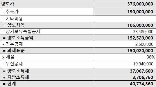 1세대 1주택 양도세 비과세 대상이 아니라면 양도소득세는 지방세를 포함하여 약 4천만원입니다.