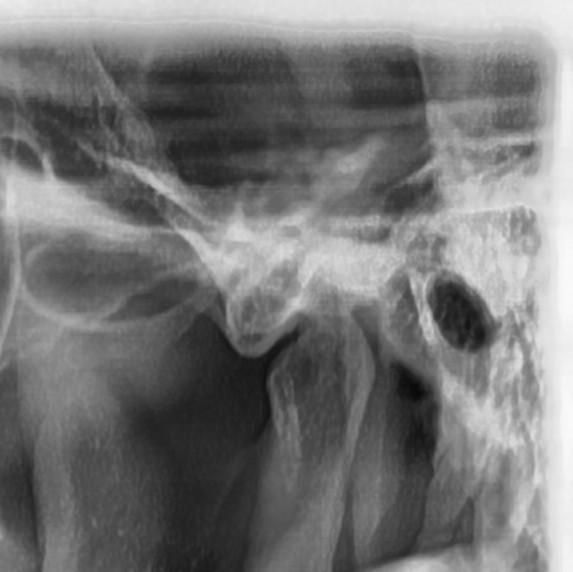왼쪽 턱관절의 condyle 모양이 다소 각이져 있긴 한데 심한 턱관절염으로 보이진 않습니다. 딱딱한 음식 피하시고, 턱 마사지 해주세요 증상이 그래도 지속되면 구강내과 가보세요
