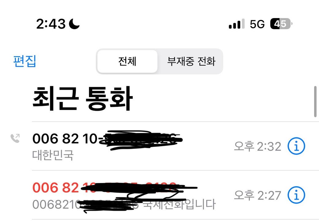 사진과 같이 006 82 (0)10-xxxx-xxxx 번호가 010번호 부재중으로 남아있어서 콜백했더니 국제전화여셔 인지하자마자 끊었습니다. 절대 전화걸면 안된다고 했는데 피해가 있을까요..? (두서없는점 죄송합니다)