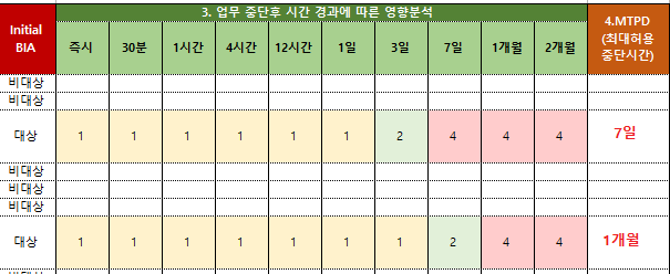 이 경우 4.MTPD(최대허용중단시간) 이라는 열에 '7일'이라고 표시되게 함수를 짜려고 합니다.