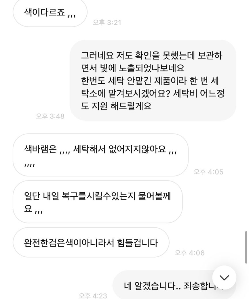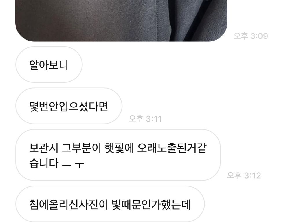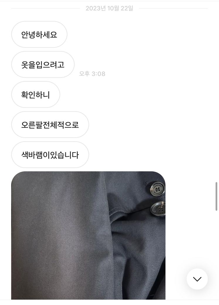 저는 이상 없다고 판단 후 판매했는데 오늘(10월 22일경) 옷에서 색바램이 있다고 연락이 왔습니다.