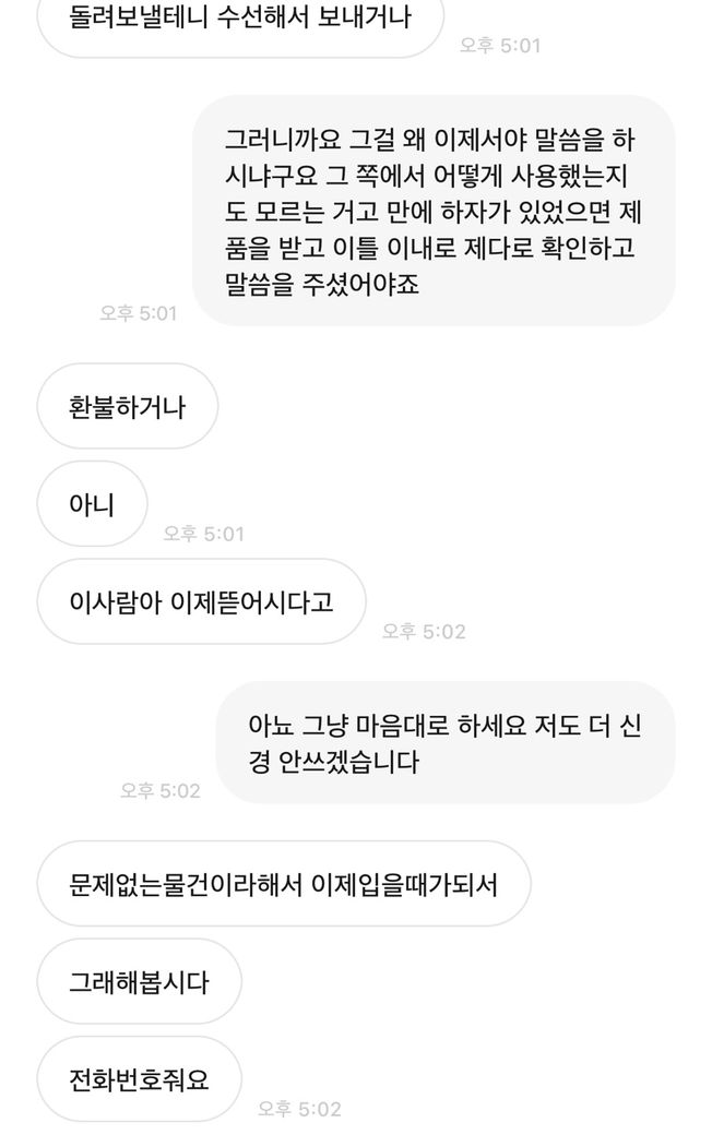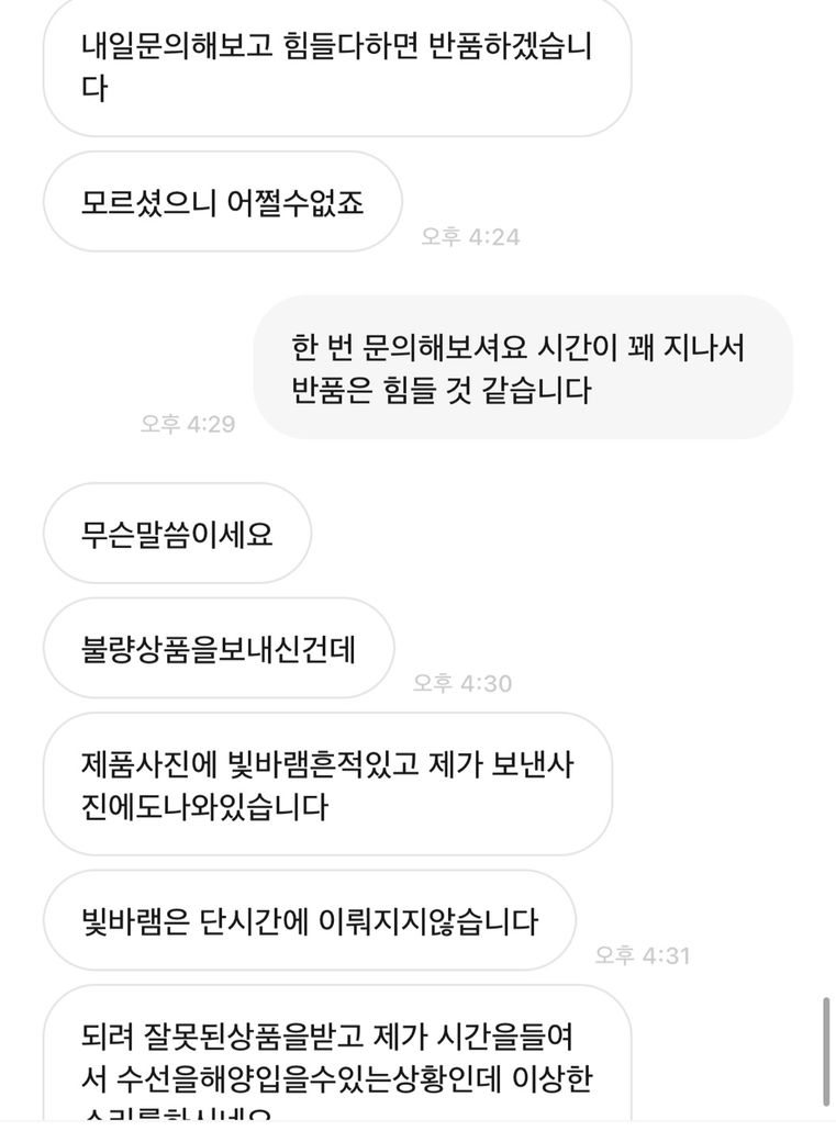 10일이나 지났고 제가 택배 보낼때 포장하고 사진 찍을 때까지만 해도 발견을 못했어서 받고 나서 말씀하셨으면 몰라도 시간 지나고 어떻게 사용했는지도 모르는데 갑자기 색바램이 있다고 환불은 못해드린다고 했더니 진정서 내고 어쩐다 저쩐다 해서... 법률을 몰라서 질문 드려 봅니다. 대화 내용 첨부합니다.