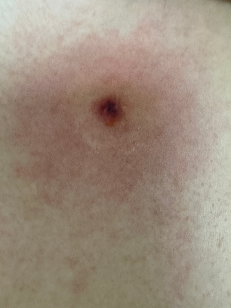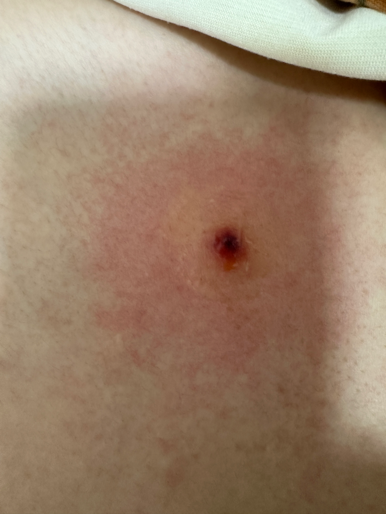 중앙에 거뭇한 부분이 있는 상처는 여드름이나 염증성 병변을 압출한 뒤에 남은 것으로 보입니다. 중앙이 거뭇하다는 것은 혈액이 굳은 것으로 보이며 크게 문제가 될 만한 상태로 판단되지는 앖습니다. 상처 부위를 깨끗하게 유지하고, 항생제 연고를 바른 후 멸균 거즈나 습윤밴드로 덮어주시기 바랍니다.