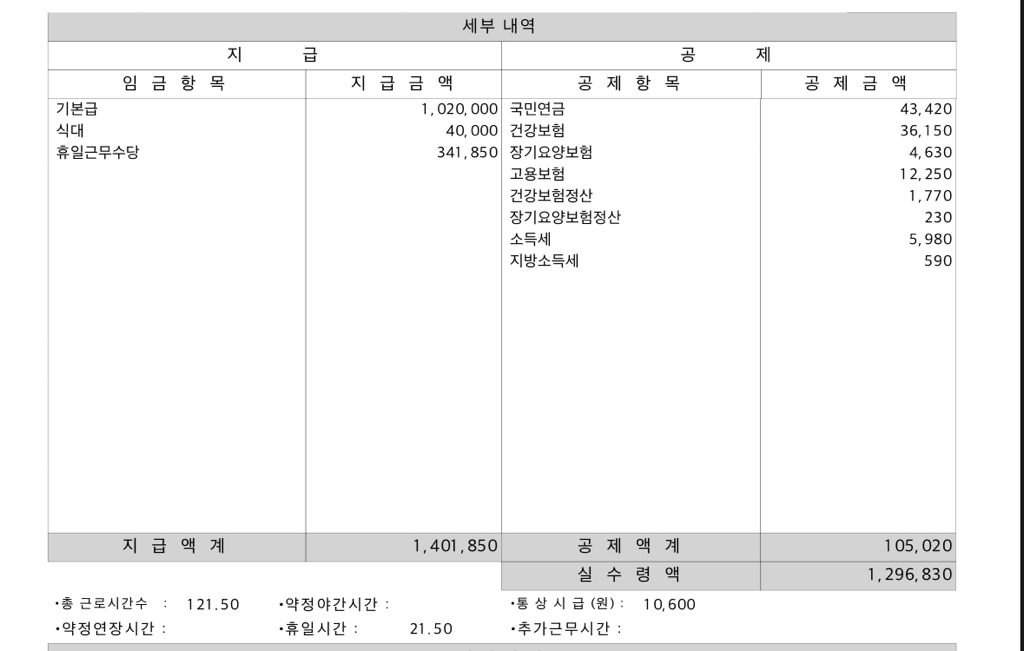 근로계약서와 임금명세서의 임금이 전혀 다릅니다. 회사에 확인해보실 필요가 있겠습니다.