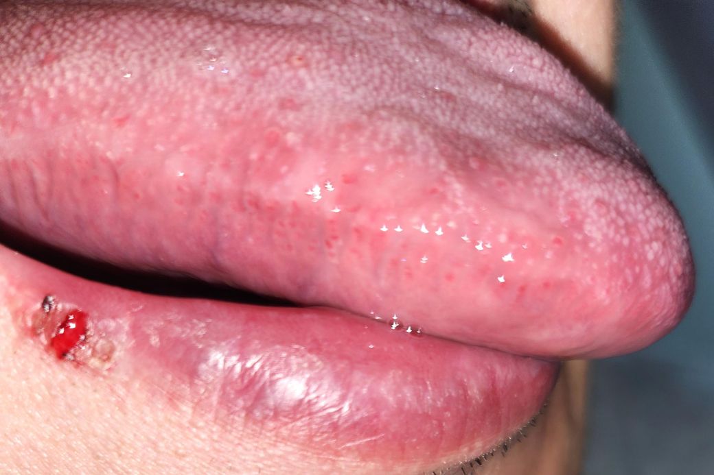 사진은 구강내에 힘이 많이 가해지게 되어 볼점막이 씹히고 혀옆면에 압흔이 생긴것으로 보입니다.