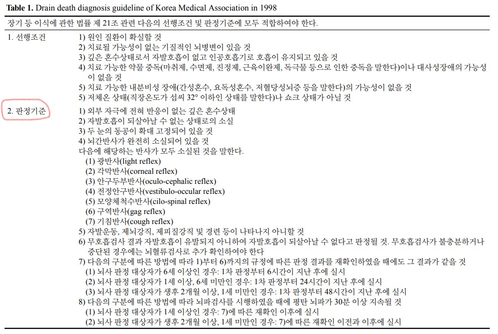 에 실린 뇌사판정조건입니다. 붉은색 동그라미 부분이 판정기준이 되겠습니다.