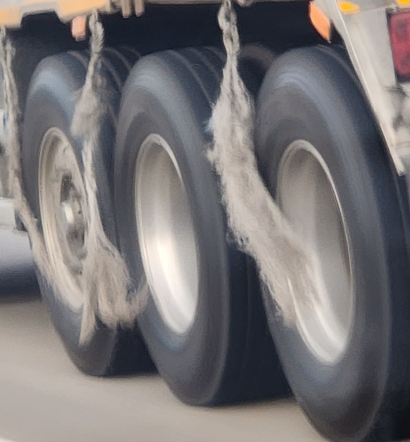 화물차의 경우 차체가 크기 때문에 세차하기가 어렵습니다. 저런 끈을 달아서 바퀴가 돌아갈때 자동으로 같이 타이어에 붙은 이물질을 제거합니다.
