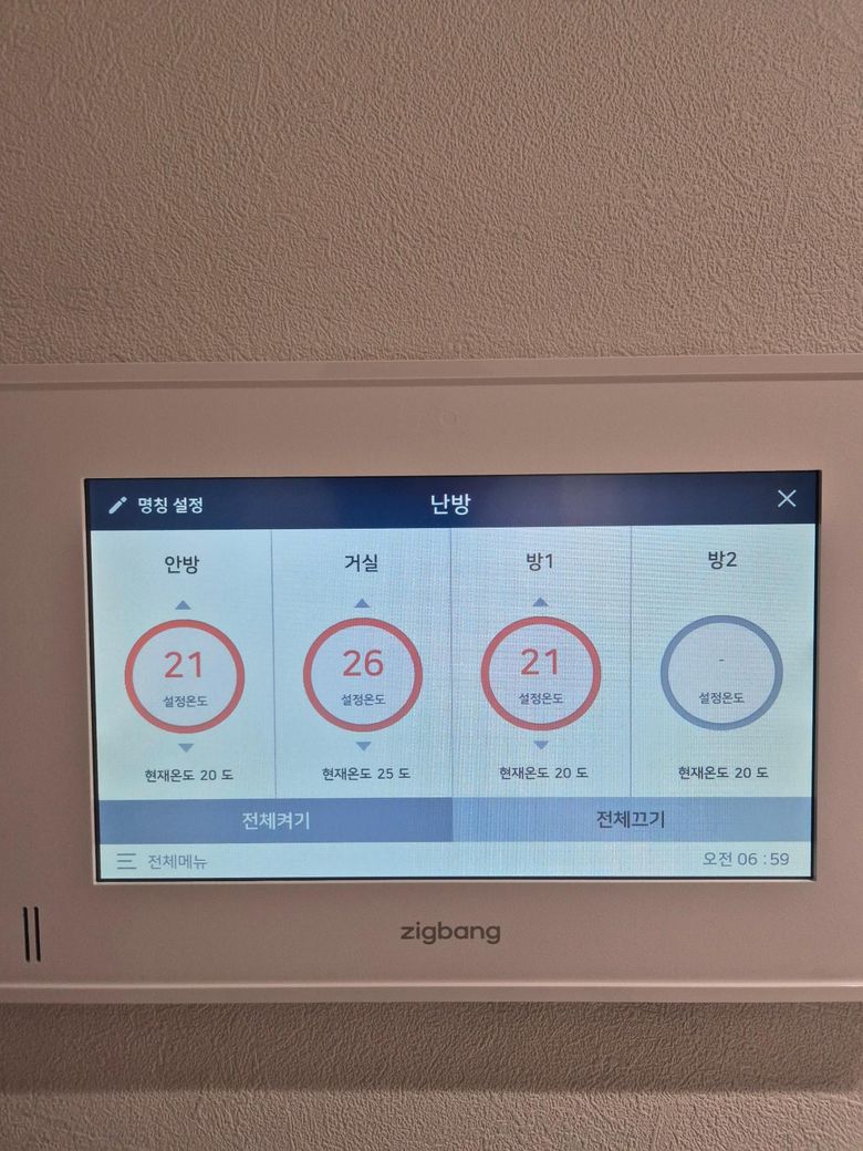 거실, 안방, 방1까지는 켜놨는데도 실내온도가 20.5도가 나오더라고요. 인터폰은 난방조절 가능하게 교체해놓은 상태입니다.