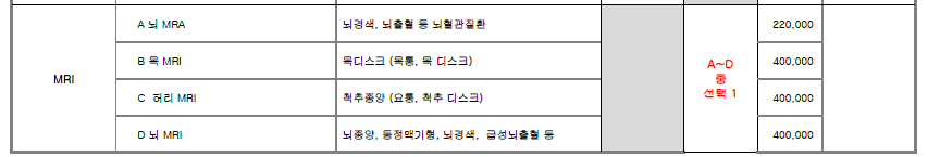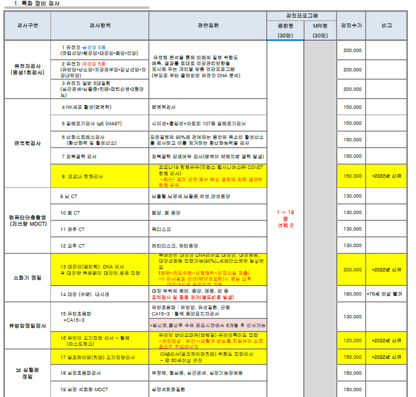 굉장히 여러가지 종류의 검사를 진행하실 수 있군요. 개인적으로는 기본적인 건강 검진에서는 암에 대한 것은 평가가 불가능하기 때문에 뇌MRI, 폐CT, 유방초음파 검사를 받으시길 권고드립니다. 복부 CT도 있으면 좋겠는데 아쉽지만 항목에 보이지는 않군요.