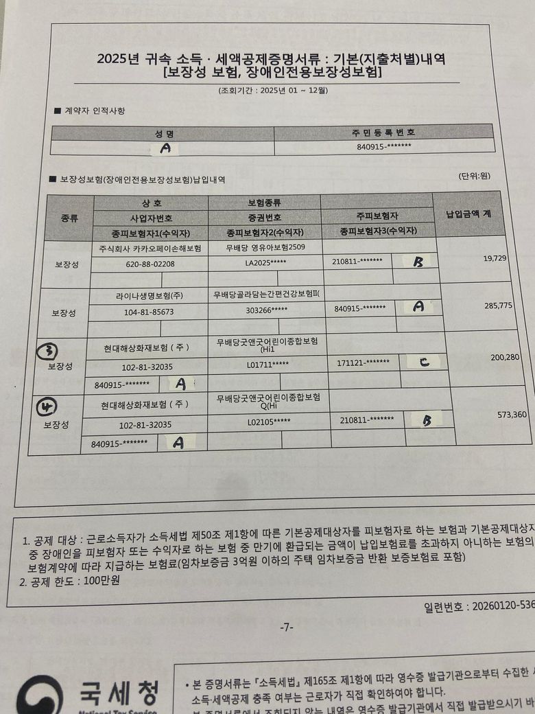 혹시 위 사진상에서 동그라미 3,4번은 B,C 보장성 보험료에 반영을 하고 A에겐 빼는 식으로 연말 작업을 해도 상관이