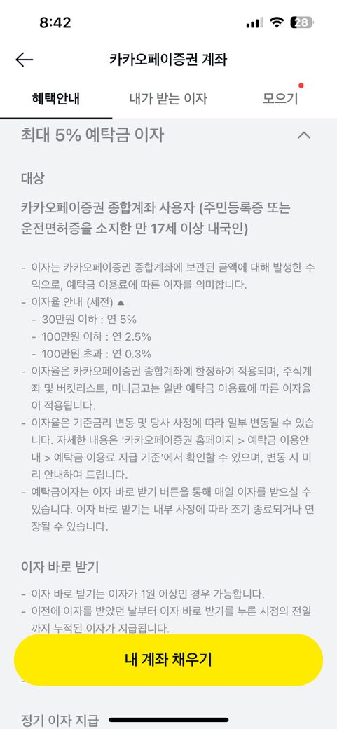 카카오페이증권 예탁금 이자료에 대해 30만원까지는 5% 이자를 적용받고, 나머지 초과분 5만원은 2.5% 이자를 적용받는다는 표현입니다.