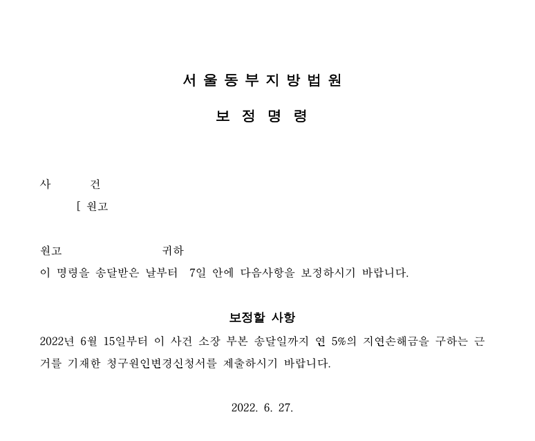 작성하신 소장 내용을 확인해보아야 합니다. 이자 약정이 없는 경우라면 연 5% 약정이 가능하나 이에 대해서는 보정 내용이 변제기가 위 6월 15일인 이유를 소명하여 보완하라는 것으로 보여집니다.