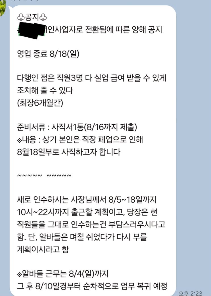 결국 3개월 이상 근무하였는데, 폐업이라는 이유로 일방 해고 통보를 받았고