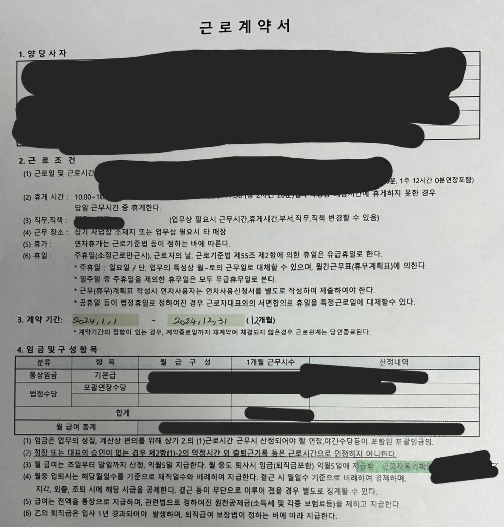 위와 같이 계약한 상황이며, 근로계약서 첨부합니다