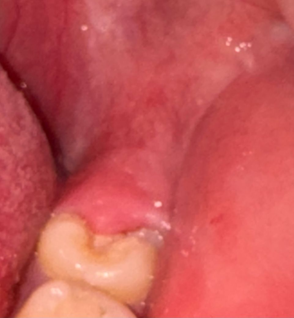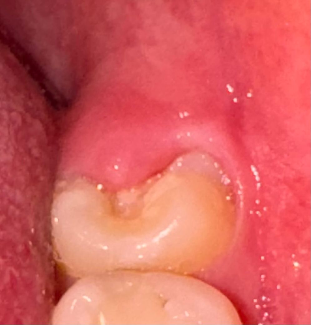 왼쪽 아래 마지막 어금니 뒤로 사랑니가 반만 나왔는데