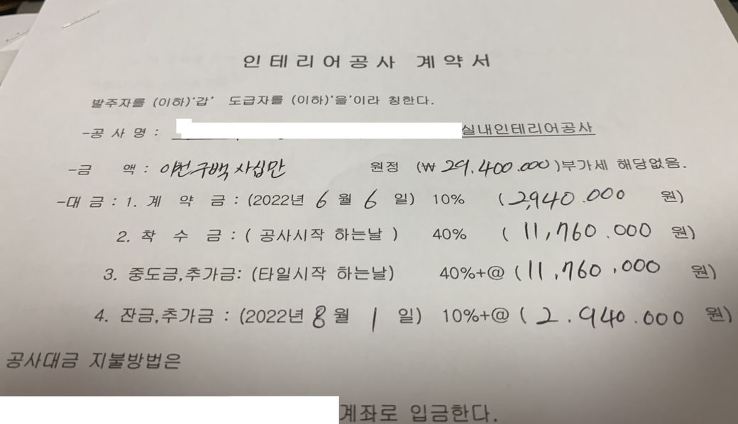 최근 구축 아파트를 리모델링하고자 인테리어 업체와 계약을 맺고 진행하는중 (모든 결제부분은 계좌이체로 진행하였습니다)