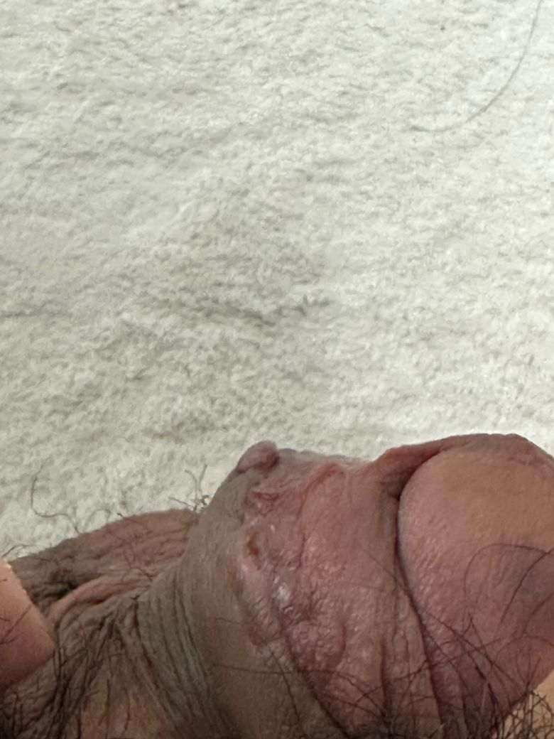사진상 위치는 음경 소대(frenulum) 부위 봉합선 근처로 보이며, 포경수술 후 비교적 흔하게 보이는 조직 돌출입니다. 수술 후 3주 시점이면 아직 상처 재형성과 흉터 성숙 과정이 진행 중인 단계라 완전히 안정된 상태는 아닙니다. 이 시기에는 봉합 부위 주변에 육아조직(granulation tissue), 봉합 흉터, 또는 소대 피부가 약간 두툼하게 남는 현상이 흔합니다.