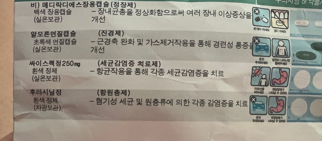 이럴때 위장약을 먹어야 하나요? 아미면 타이레놀을 먹어야 하나요? 아니면 사진에 나온 항생제가 문제인가요? 정확한 답변 바랍니다