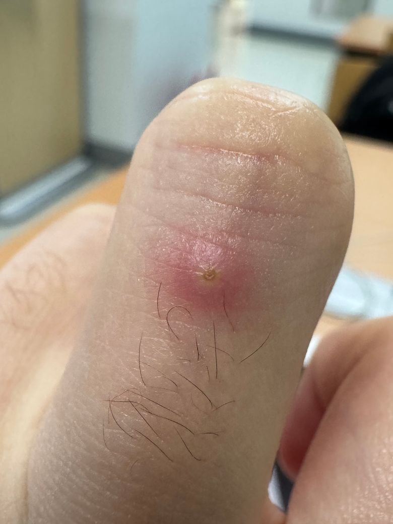 염증이 발생한 상태로 보입니다. 이물이 들어갔거나 무언가 지저분한 것에 찔렸거나 하여서 발생한 소견일 가능성이 높아 보이지만, 단순 뾰루지도 관리가 잘 되지 않으면 사진처럼 보일 수 있습니다. 혼자서 고민하시기 보다는 피부과에서 처치를 받으시는 것을 권고드립니다.