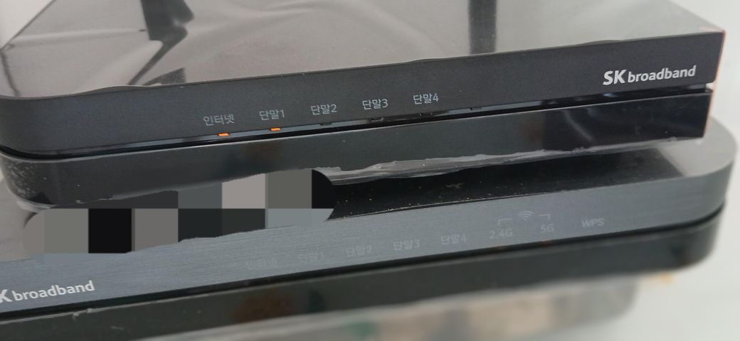 사진에 보이듯이 아래가 공유기이고 위가 모뎀입니다.