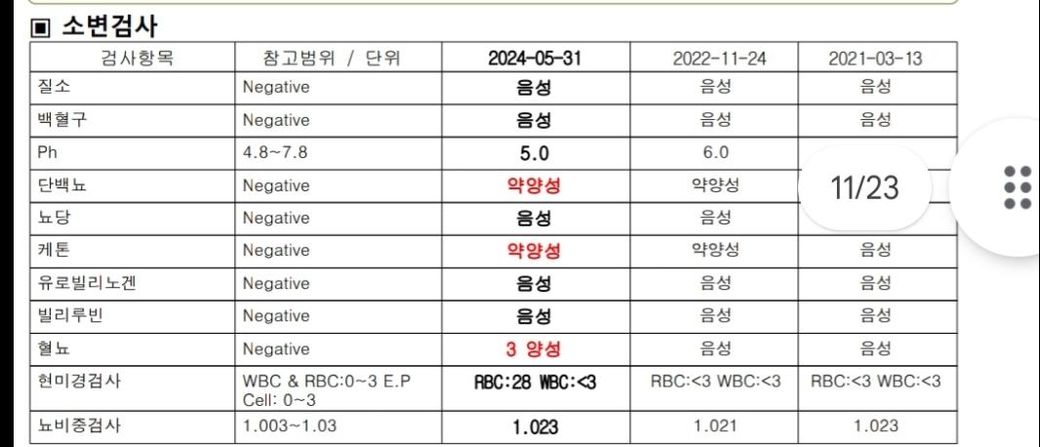 단백뇨및 혈뇨의 경우는 비뇨계 질환이 있을 수도 있고 일시적일 수도 있으니