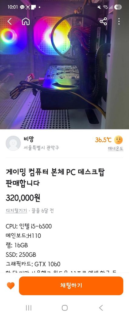 질문자님 예산 25~40만 원 내에서 발로란트와 마인크래프트, 산나비, 스팀 게임 정도를 쾌적하게 즐기고 싶으시다면, 새 컴퓨터로는 다소 제한적일 수 있습니다. 중고 컴퓨터를 당근에서 구매하는 것은 가성비 측면에서 좋은 선택일 수 있지만, 사양과 컨디션을 꼼꼼히 확인하는 게 가장 중요해요. 특히 판매자 기록에 온도가 36.5도라고 적힌 점이 어떤 의미인지 정확하지 않아 불안하실 수 있는데, 이 부분은 PC 상태나 내부 청소, 쿨링 상태를 잘 물어보시는 게 좋습니다.