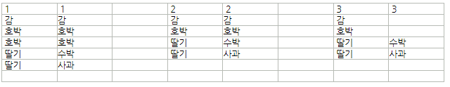1에서 중복제거를 하면 결과 2에서 호박행만 삭제가 됩니다.