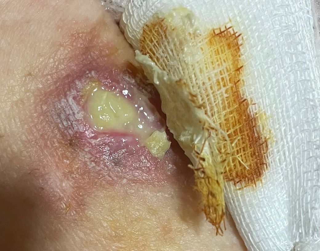 다만, 노란 부분이 점점 늘어나거나, 악취가 나고, 붉은 염증 반응이 심해진다면 감염을 의심해볼 필요가 있습니다. 현재처럼 이틀에 한 번씩 드레싱을 계속하면서 경과를 지켜보되, 상처가 더 악화되거나 통증이 심해진다면 병원에서 추가 진료를 받아보는 것이 좋습니다.