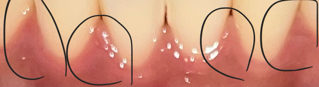 치실이나 치간칫솔을 너무 강하게 햇다면 마찰력때문에 잇몸이 저렇게 될수 잇습니다. 일시적인 현상이니 너무 걱정은 안하셔도 될것같습니다.