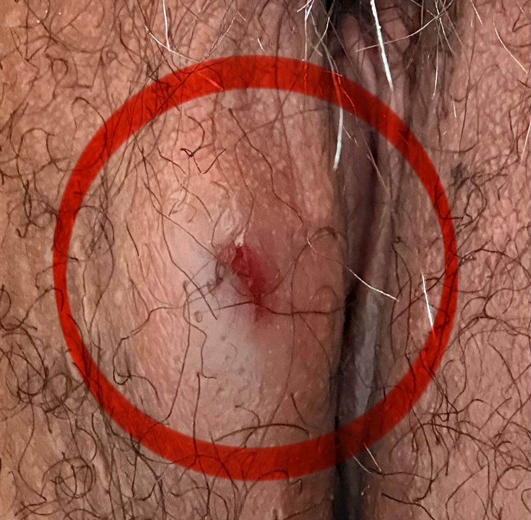 사진상 병변은 외음부 피부가 부분적으로 열리면서 표재성 미란 또는 균열(fissure)처럼 보입니다. 주변 피부가 약간 부어 있고, 중심부는 붉게 노출되어 있어 마찰이나 건조, 면도, 꽉 끼는 속옷 등에 의한 단순 피부 열상 가능성이 가장 높아 보입니다. 성관계가 없었다면 성매개감염 가능성은 낮습니다. 흰색이나 푸른색으로 보이는 부분은 점막 아래 혈관이 비쳐 보이는 것으로 보이며, 눌렀을 때 약간 단단한 느낌은 염증 반응에 의한 국소 부종일 가능성이 있습니다.