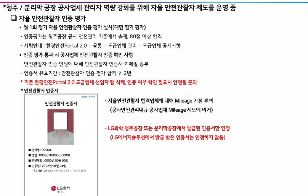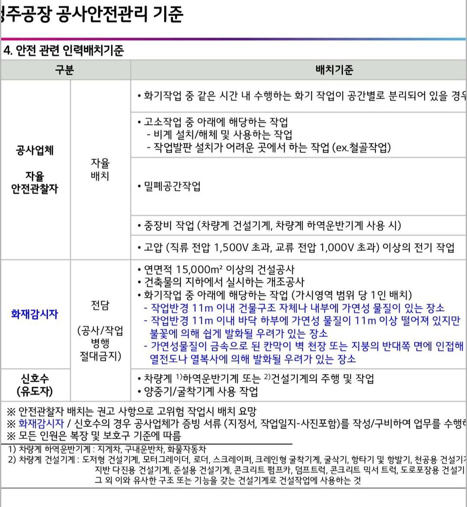 4. LG화학 2차 협력 건설사인거 같은데, 1억 미만 공사여서 실제로 안전관리자 선임은 의무도 없고 LG내규에 따라 공사업체 자율배치인 안전관찰자로 들어온 것으로 보입니다. 안전관리자는 공사/잡일 못하게 되어 있는걸로 아는데 이건 단순 자율배치 말곤 이야기가 없어 잡일/공사도 병행하는 거라고 보는데, 17일에 안관관찰자 LG사내에서 보는 시험이 있었는데 그것도 뒤늦게 알려줬습니다. (법정 자격증으로 산업안전산업기사는 갖고 있습니다. 근데 그거는 쳐주지도 않는데요. LG안전관찰자 시험 쳐서 80점 이상 맞아서 합격해야 선임해준다는 식으로 말을 바꿨습니다)